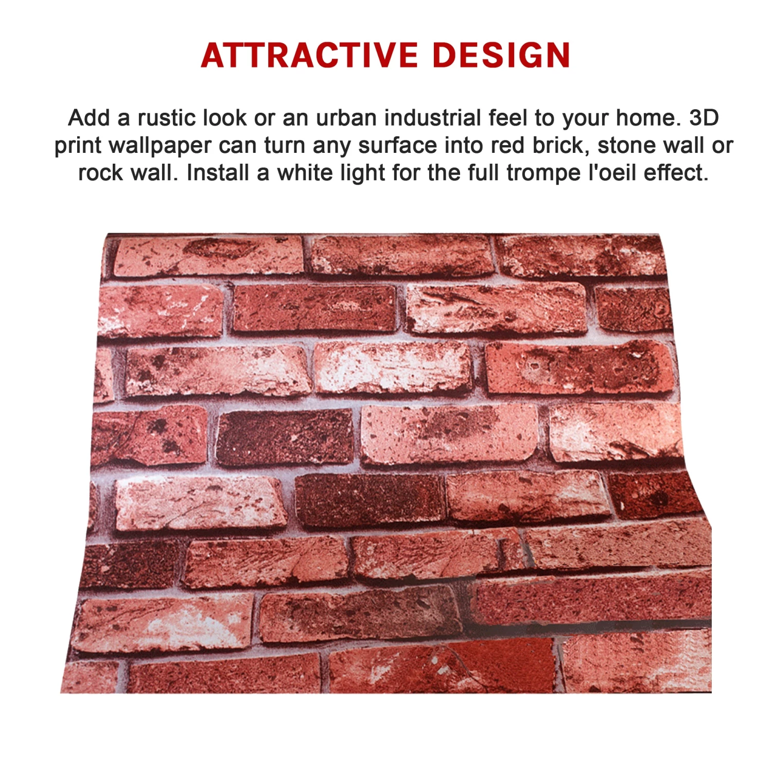 Add a rustic look or an urban industrial feel to your home. 3D print wallpaper can turn any surface into red brick, stone wall or rock wall. Install a white light for the full trompe l’oeil effect.