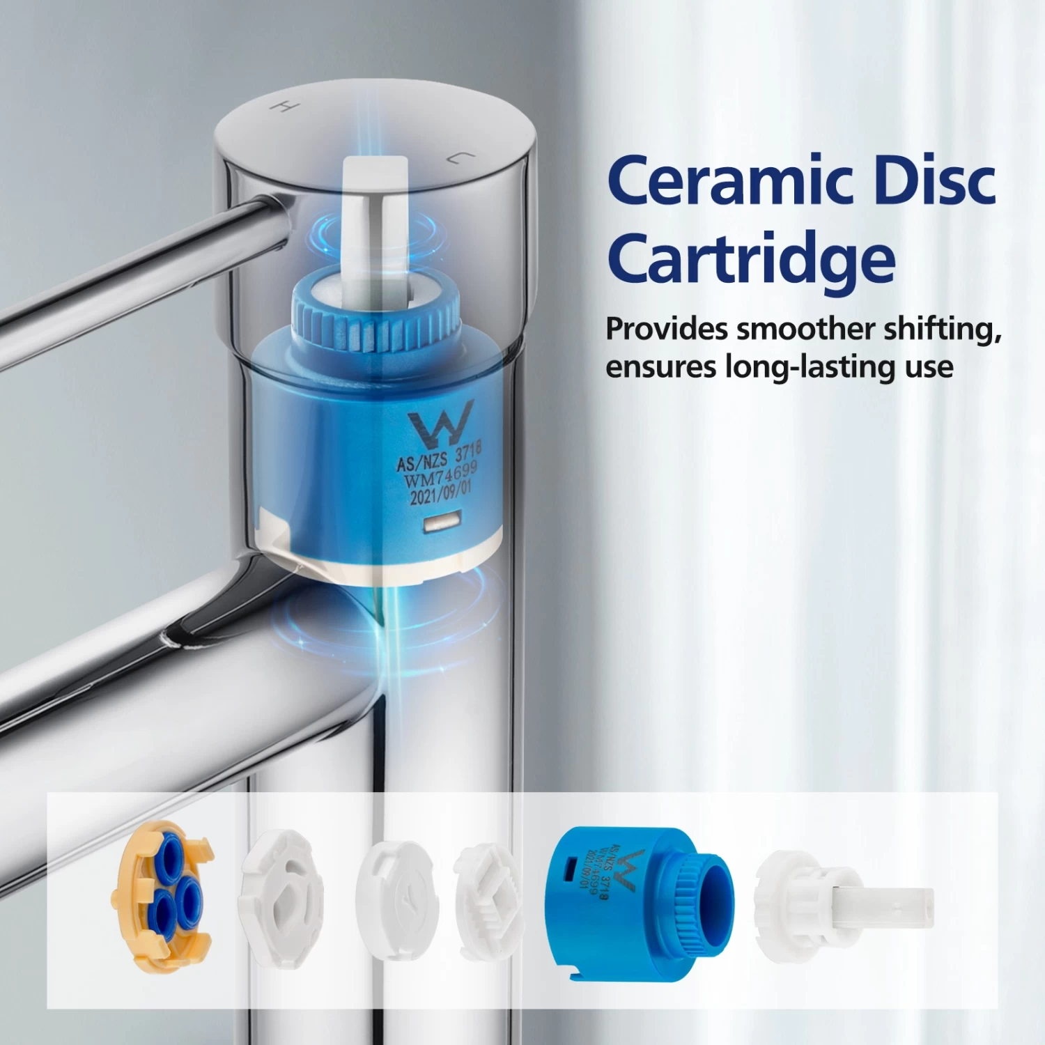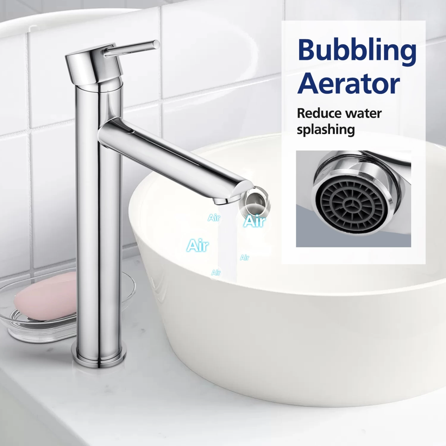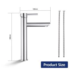 This high rise bathroom tap is made of durable solid brass construction materials that ensures it is anti rust for years. Made with user-friendly design and polished in chrome for a beautiful and glossy look. This bathroom tap is Watermark and WELS approved, suitable to fit basins with hole diameter between 35 to 55 millimetre. Comes with Watermarked ceramic disc cartridge and water hoses, it is easily to install with included set of mounting accessories. This product also includes a 5 year warranty and a 6 month warranty on the installation parts'(cartridges, screws, nuts, and etc.)