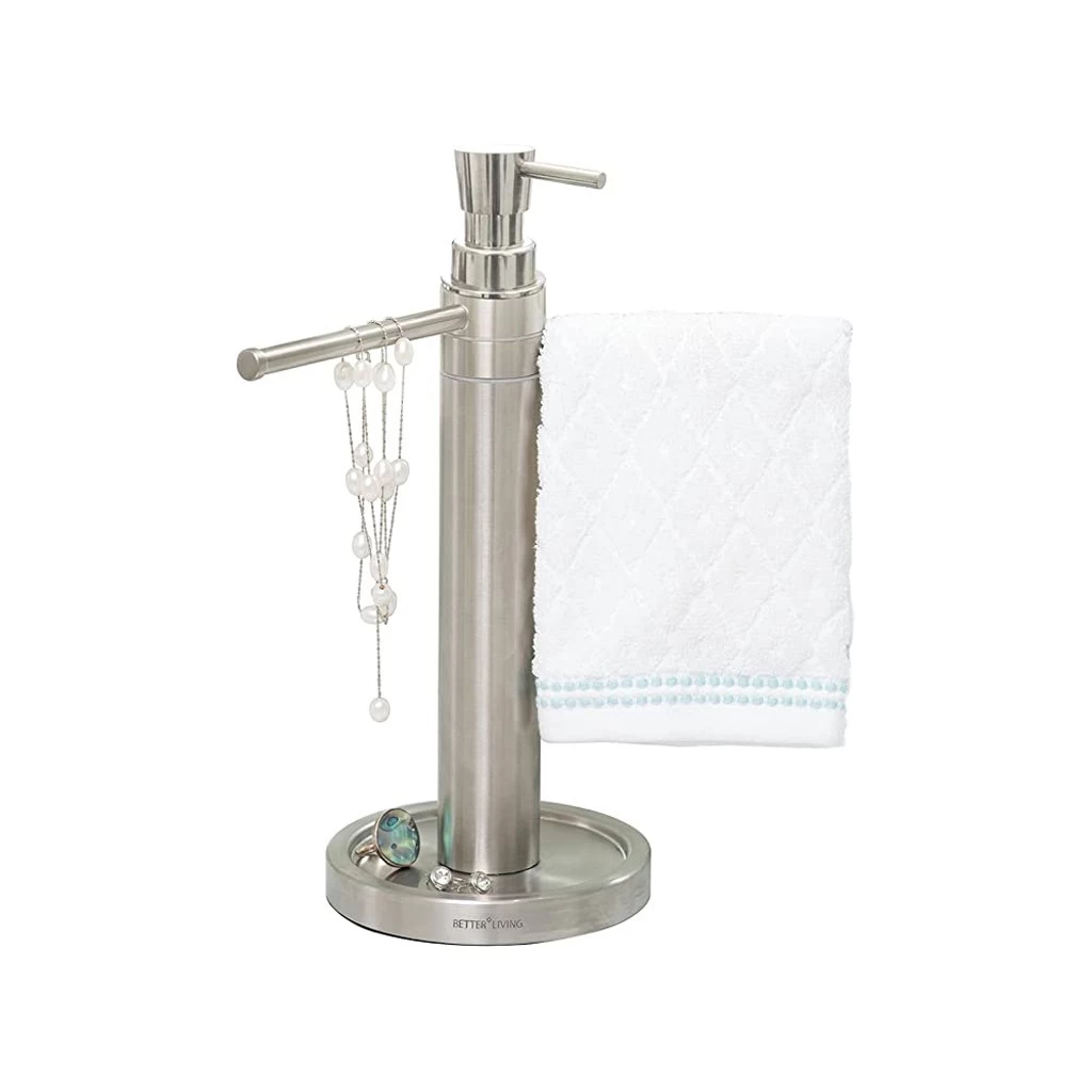 HANDI is a new family of vanity-top organisers. The Hand Washing Valet is a fusion of a soap dispenser and vanity towel stand into one compact organiser. This all-in-one station dispenses hand soap and keeps your towels at a fingertip’s distance away. It even includes a tray to rest your rings and other jewellery.