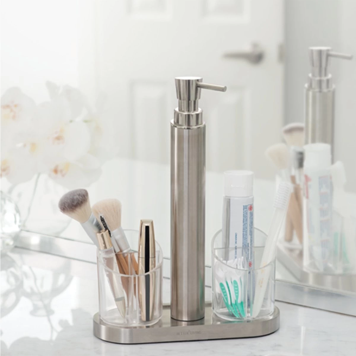 HANDI is a new family of vanity-top organisers. The Vanity Valet is so much more than your typical dispenser. HANDI includes two multi-purpose divided organisers for your make-up brushes and comb, and a dispenser that holds 225 ml of your favourite make-up remover. Alternatively, use HANDI to store your toothbrushes and paste.