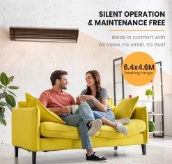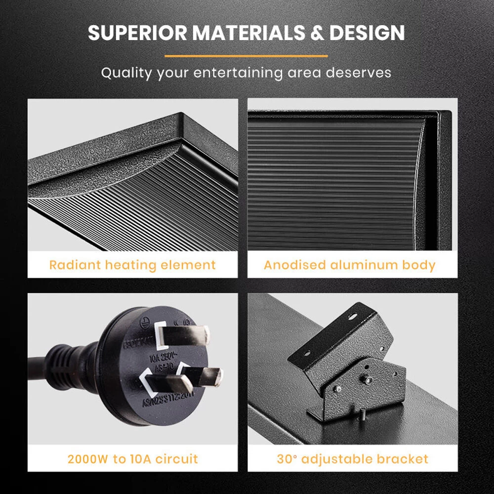 A 2400 watt electric element is embedded in the black anodised aluminium strip that rapidly produces even and gentle heat dispersion. Plus, unlike gas heaters there is no glow or glare, and no need to refuel.