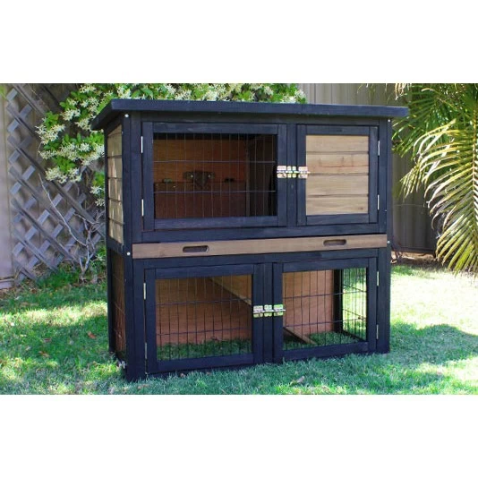- Doors: Bottom Level – Wire door -35x30cm each (WxH); Top Level – Wire door 43x30cm (WxH); Solid door 28x30cm (WxH) Internal access 26x18cm (WxH)