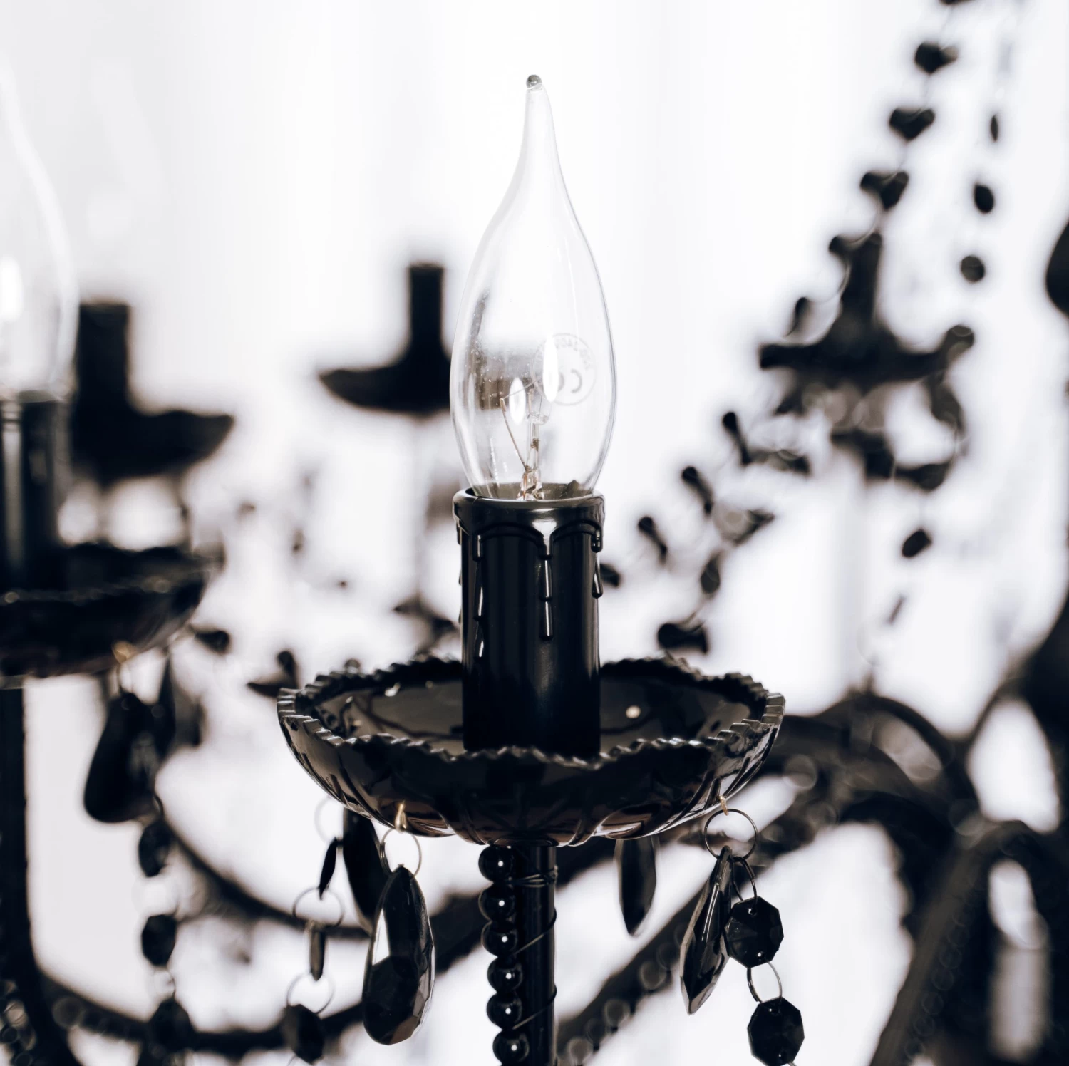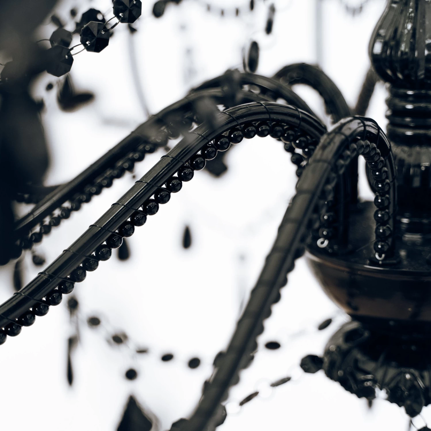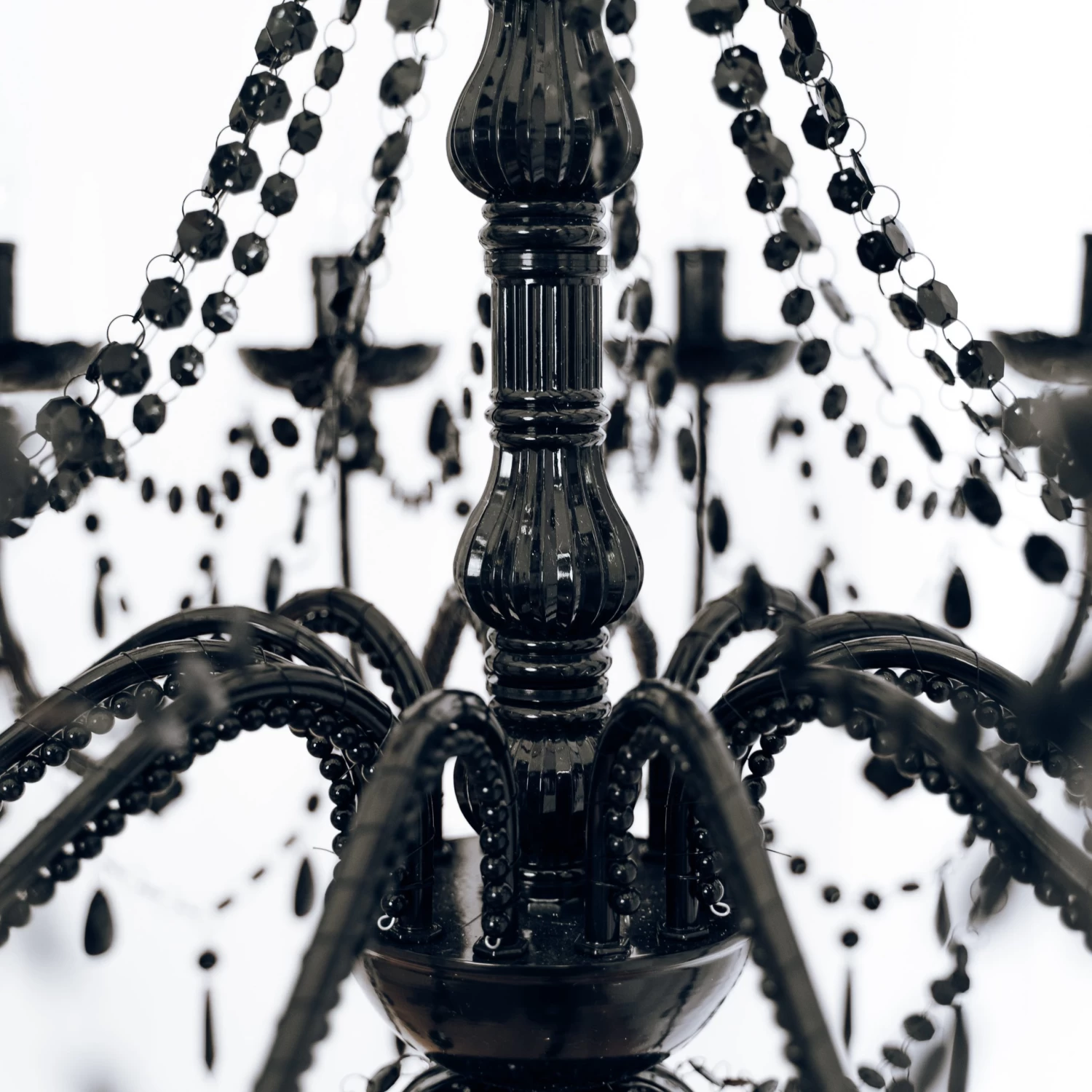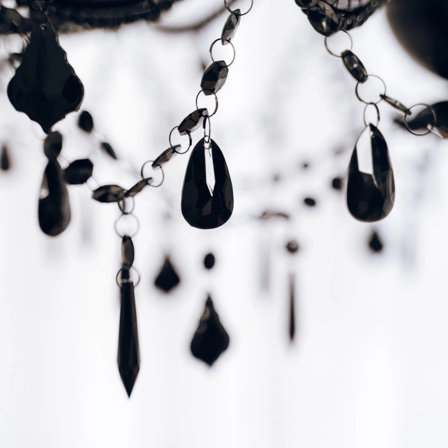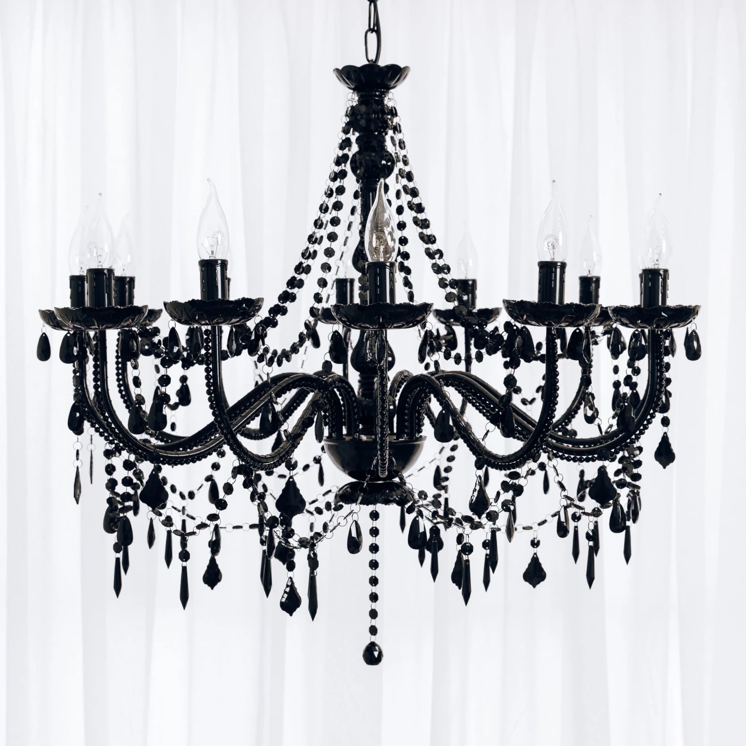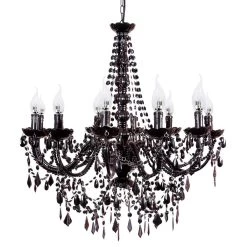 This stunning french provincial chandelier is made from black acrylic crystals and cups, glass centre post and black painted metal arms.