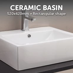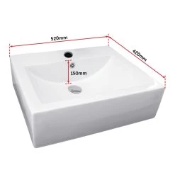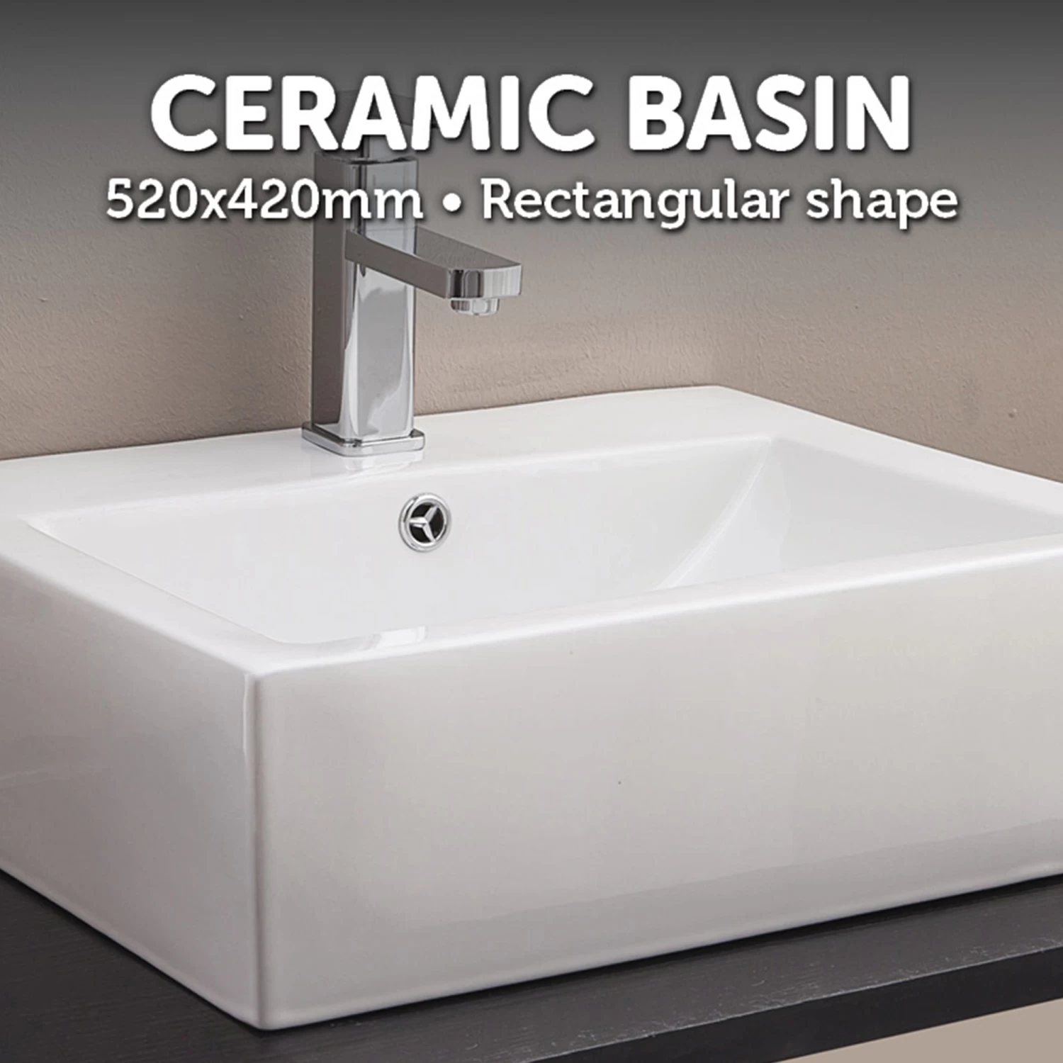 This attractive above-the counter basin is made from a ceramic construction. There is no danger of the basin overflowing with its no-overflow tap hole. The basin is rectangular in shape and measures 520 x 420 x 150mm.