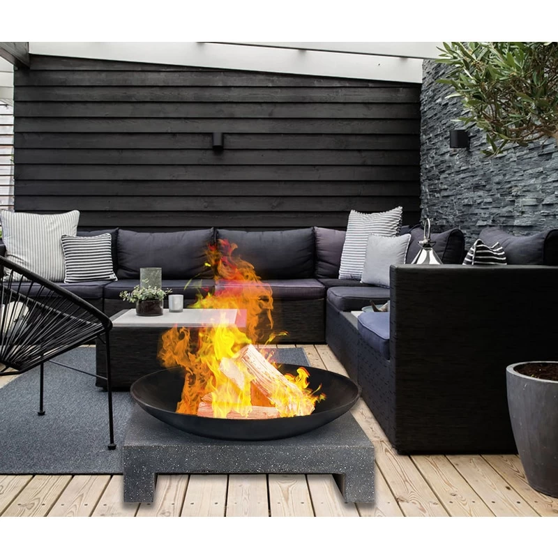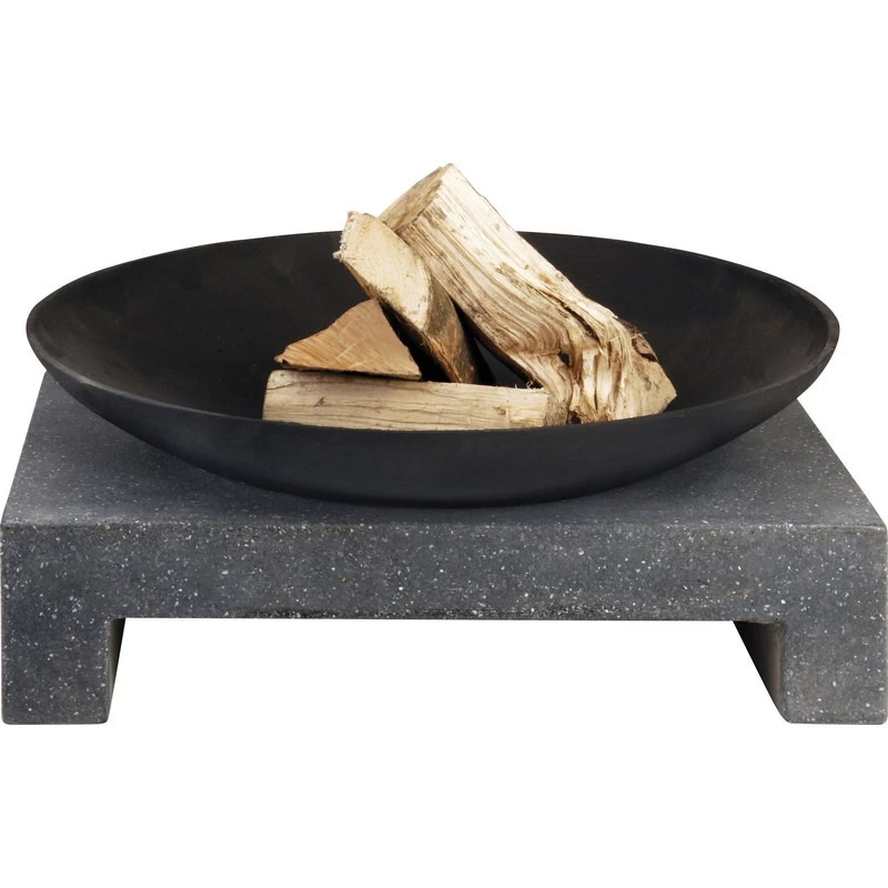 The granite style base is made of conglomerate stone and cement with extremely durable black iron bowl which is great for a low flame for roasting marshmallows or just lighting up the evening.