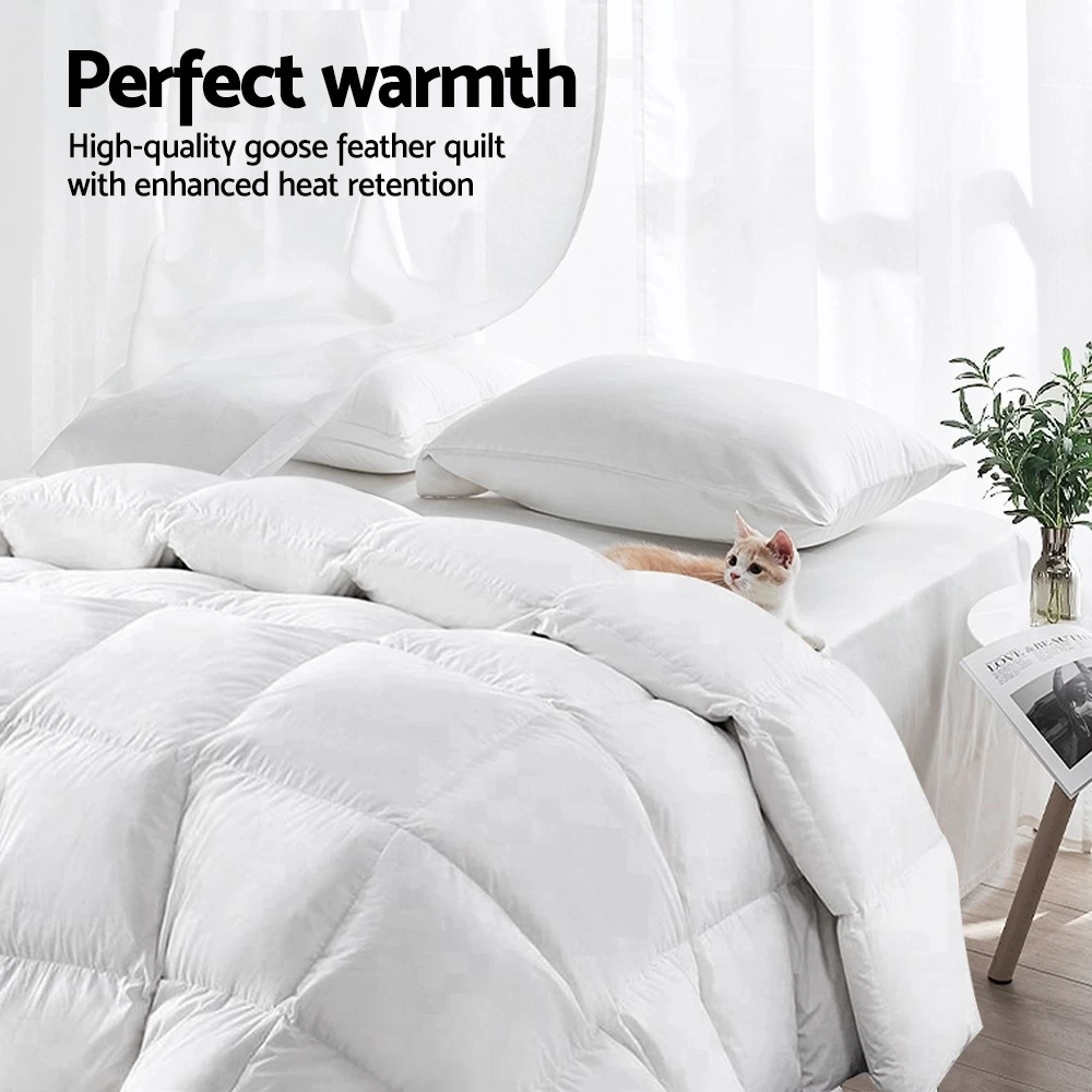 Indulge in luxury warmth with this finely constructed quilt. It is filled with goose feathers and down with 500gsm weight, suitable for cool to winter weather. The baffle construction prevents shifting of the filling and helps to expand the down to retain heat, providing optimal warmth. Designed for comfort, this featherweight quilt is perfect for winter and cooler days.
