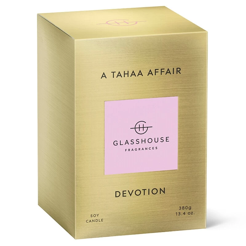 The Glasshouse 380g A Tahaa Affair Devotion Butterscotch Caramel & Jasmine Triple Scented Candle is a transcendent everyday luxury that brings the islands to your home. It is filled with a Tahitian tropics-inspired mix of luscious Caramel, Cedarwood and a twist of Jasmine Sambac that is encased in a beautiful glass vessel with a lid. This triple-scented collector’s edition candle makes a gift anyone will love.