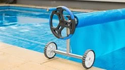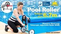 The telescopic roller is aluminium and the legs are stainless steel so this unit is the weather, chlorine, and salt resistant.