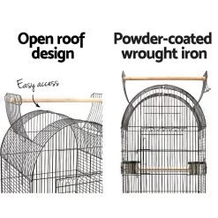 Made of sturdy, high quality and durable powder-coated wrought iron, the dome cage comes with a large access door, two small side access windows to swing in the stainless steel feeders, two timber perches and a removable tray for easy clean up. Better still, the domed roof can also be opened from the top.