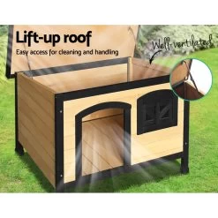 This quality Fir wood built dog kennel fits larger size dogs and is weatherproof and UV stabilized. Vents at the front and rear help to ensure that your pet is kept well ventilated with fresh supplies of clean air.