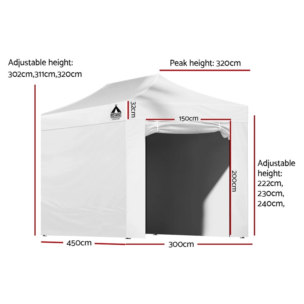 The INSTAHUT gazebo has 4 adjustable height levels to suit different height needs. It is ideal for markets, sporting events, camping, garage and yard sales, school events, trade shows and many more.