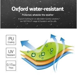 Measuring 3m x 3m, the Gazebo is made of waterproof and UV-resistant PU Coating Oxford fabric that holds up well and firm. The tent offers all-round panel enclosure and also has a bonus mesh panel to keep irritating insects and bugs out as well as letting fresh air in. No more worries about hot summer days.