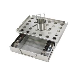 This multi functional grill topper offers five ways of cookin’ on your BBQ all rolled into one neat compact unit! Designed for the space-conscious consumer, this stainless steel grill topper does it all! It functions as a beer can chicken roaster, kabob rack, grill topper for fish, veggies, etc., a Jalepeno roaster or humidifier/smoker. Just fill with the liquid of your choice to use as a humidifier or fill with wood chips to use as a smoker.