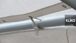 Due to the size of this item it is not possible to determine the type of fixing that may be required in all circumstances and uses. It is important for the user to determine how and where the item is used and to be aware that the structure needs to be adequately secured to prevent damage to the structure and/or injury to people due to wind. In some circumstances (eg: wind-sheltered courtyards) it may be adequate to use sandbags and light guy ropes to secure the item. The user must keep in mind that this item has a large surface area and may need to be guyed down to other fixed structures, heavy sandbags, or a combination of both to prevent damage from wind. The adequate measures required to secure the structure under the circumstances of its use are left to the user to decide.