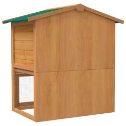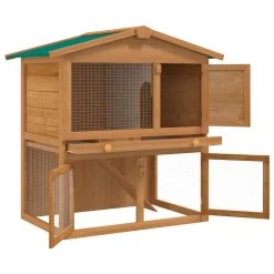 The rabbit hutch is built with high-quality wood frame, making it a strong and safe enclosure that lasts for years. Its green roof keeps rain away while the cozy cubby makes the perfect sleeping area. An easy-climb ramp leads from the lower ground level to the upper floor. A pull-out tray makes cleaning easy. And the doors close easily and lock with slide-bolt latches.