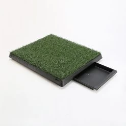 The tray is consisted of 3 separate layers: synthetic grass layer on top, smart urine drain designed to drain your dog’s waste to the removable urine catch tray at the bottom side. The side tray is convenient to quickly dispose urine as you do not need to remove the whole tray to empty the tray. These 3 separated layers provide the best results as it prevents the grass on top to be soaked so that your pet does not step on a wet grass when he/she needs to use the toilet again.