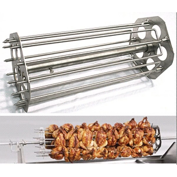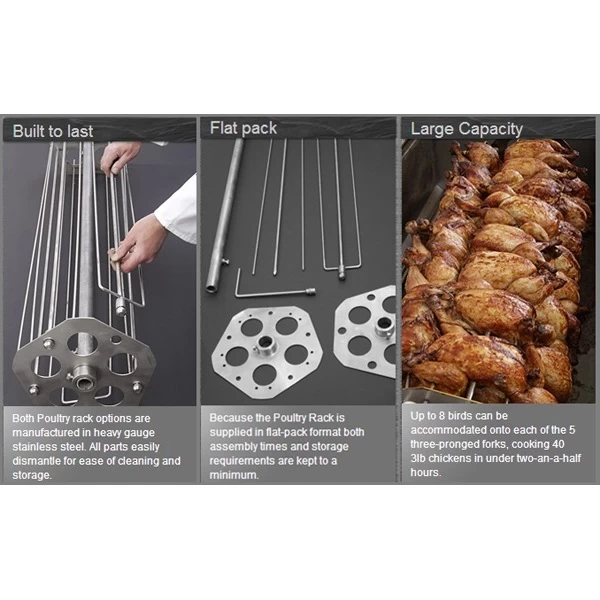 Increase the versatility of your hog roast machine with this poultry rack, cooking up to 40 chickens at one time. Made from high grade stainless steel & simply bolts onto your existing hog roast skewer with 2 bolts. The poultry rack is supplied in flat-pack in format both assembly times and storage requirements are kept to a minimum.