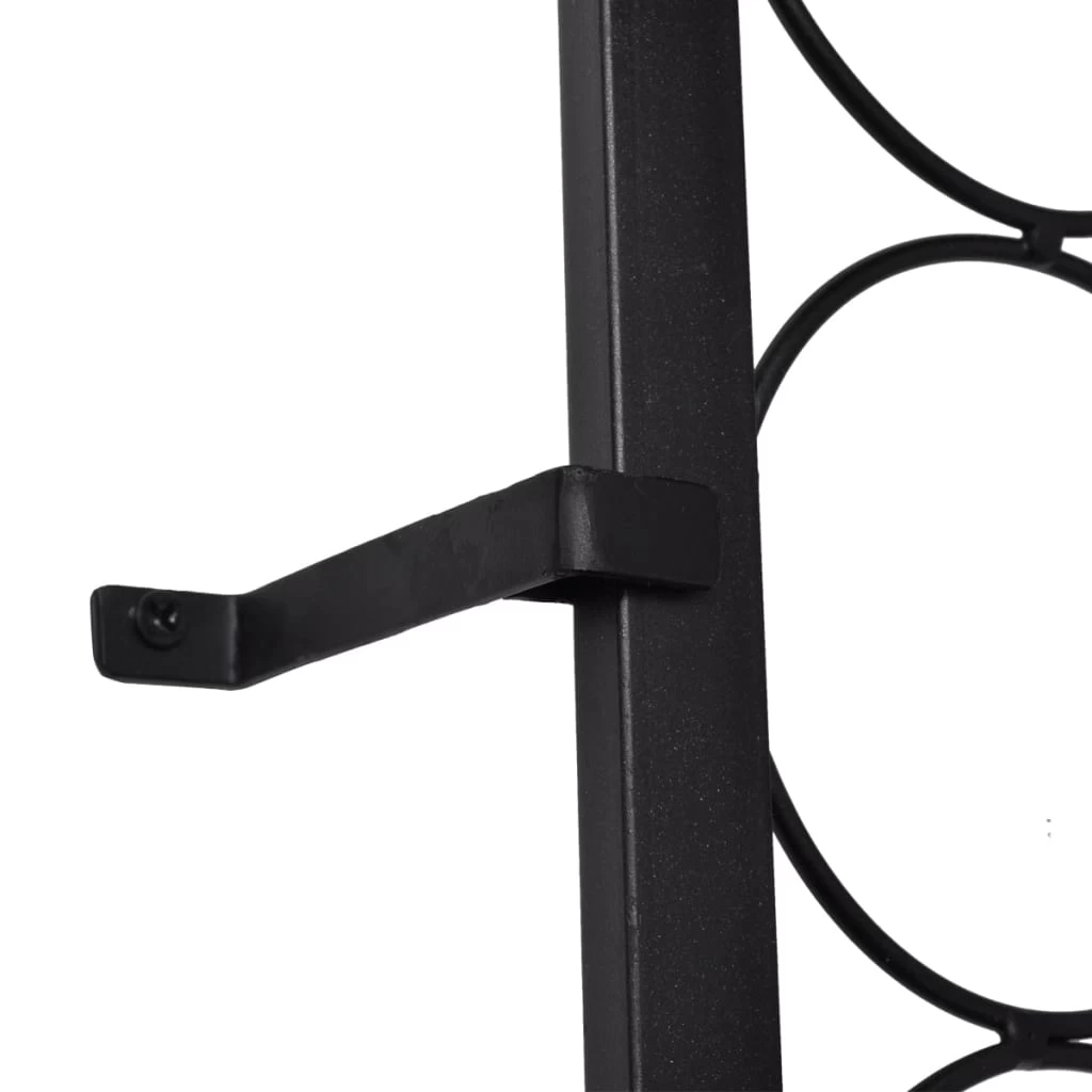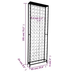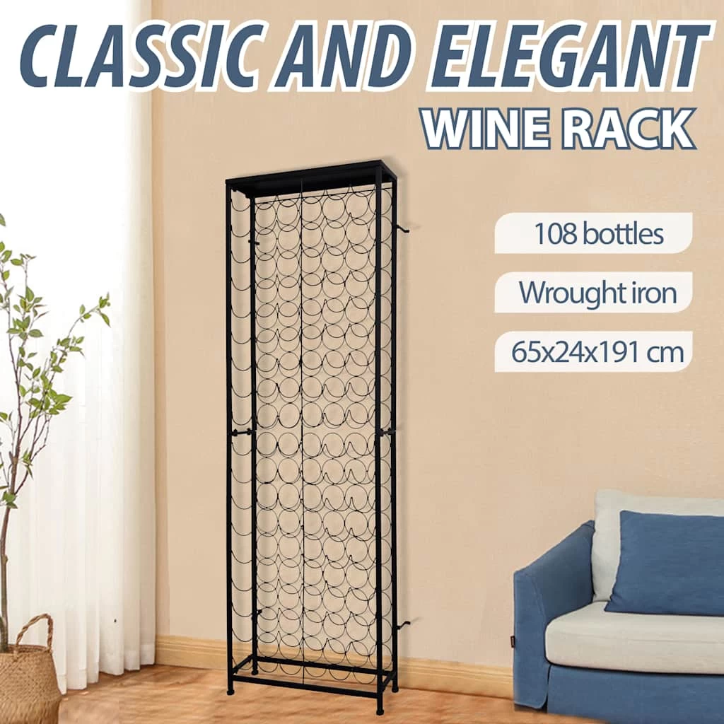 This standing wine rack is a real eye-catcher. Made of wrought iron, this durable wine rack is fully powder coated to inhibit rust. This wine rack holds up to 108 bottles. It is classic and elegant in style. It would also make a great gift for wine-loving friends and acquaintances. Thanks to the fixtures included in the delivery, you can fix the rack to the wall to make it more stable.